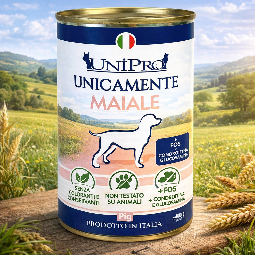 Unipro Uniquement Dog Adult 400 g est l'aliment humide monoproéique idéal pour les chiens adultes de toutes races, parfait pour ceux qui ont des intolérances alimentaires. Réalisé avec une seule source de protéines hautement digestible, il garantit un repas sain et nutritif sans additifs chimiques.